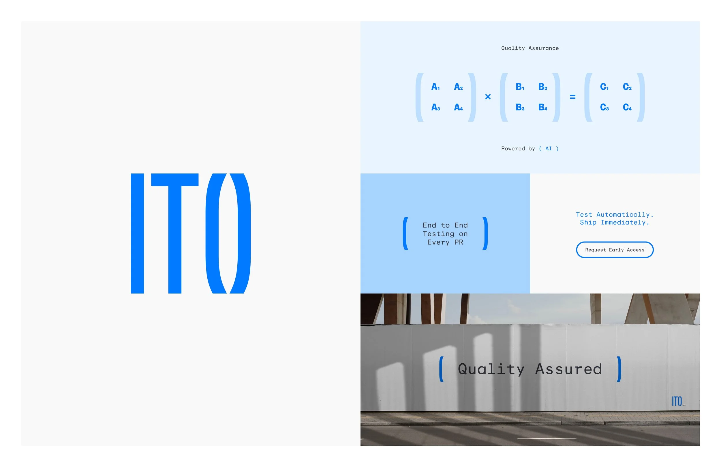 Logo and identity system for QA tech giant, Ito. The logo references matrix multiplication as the foundational computational operation powering modern AI.